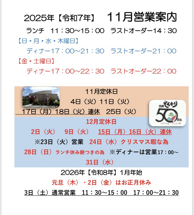 グランドメニュー更新、休日ランチメニュー追加、その他、更新しました。
